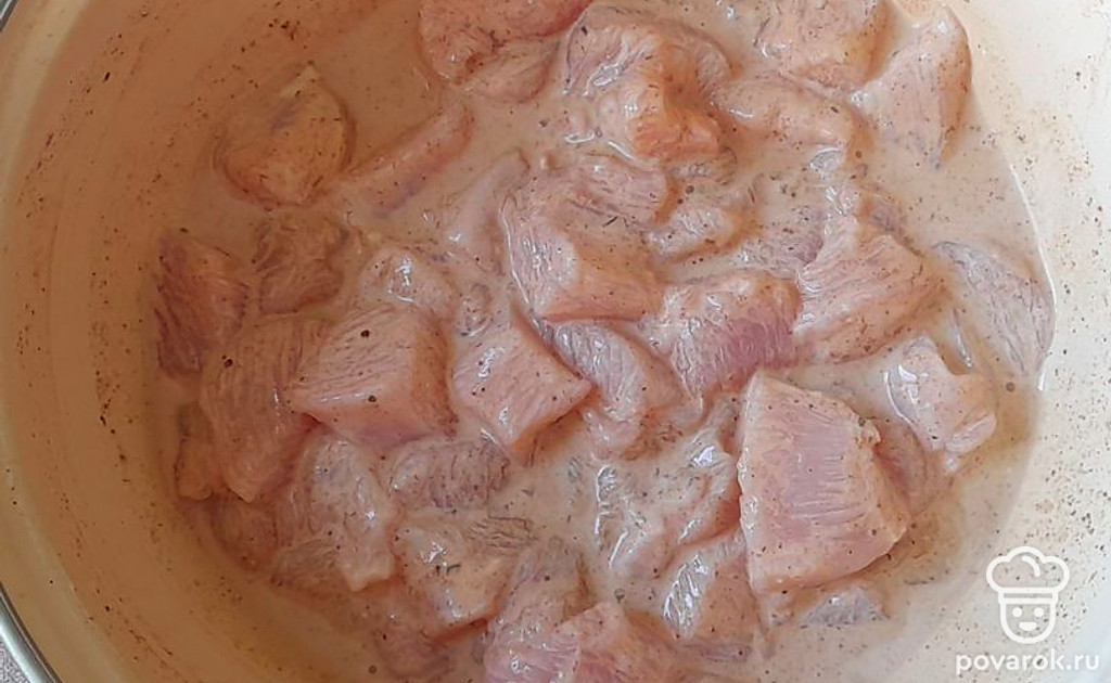 Нарезать кубиками мясо и замариновать, добавить специи по вкусу, соль, сметану.