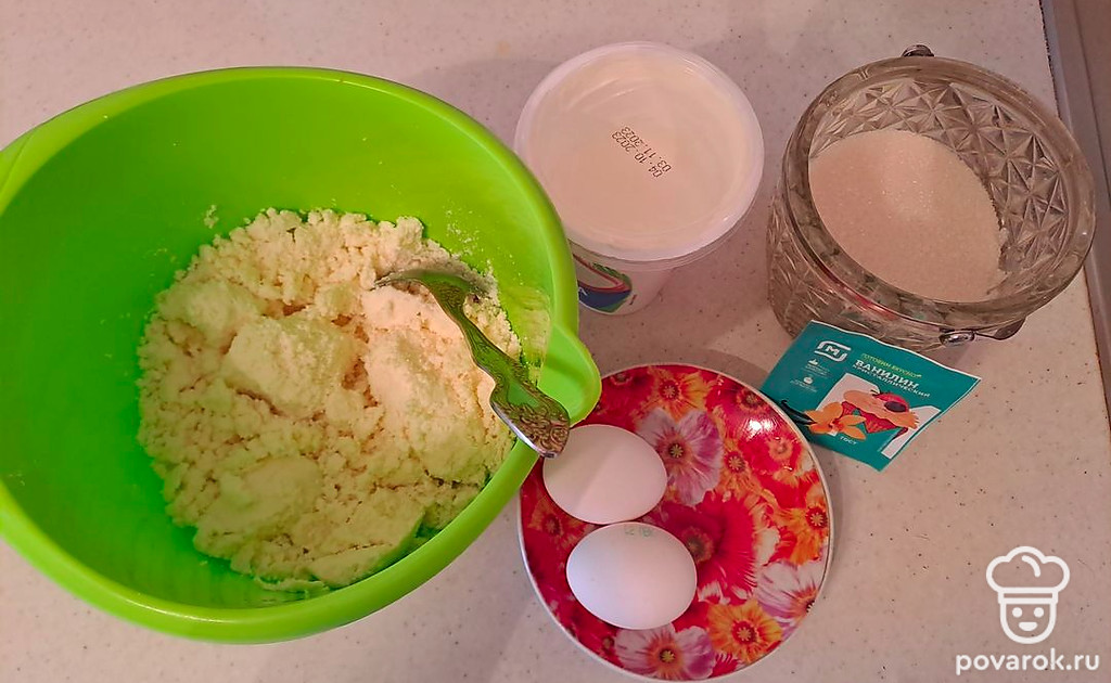 Смешать творог, сахар, ванилин, сметану, яйца.