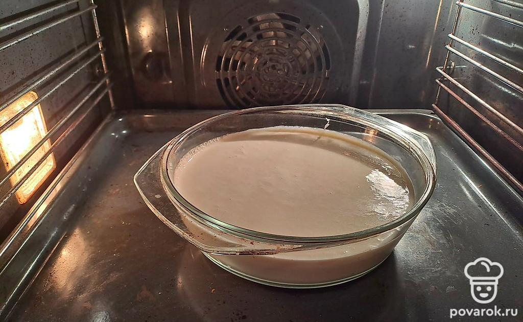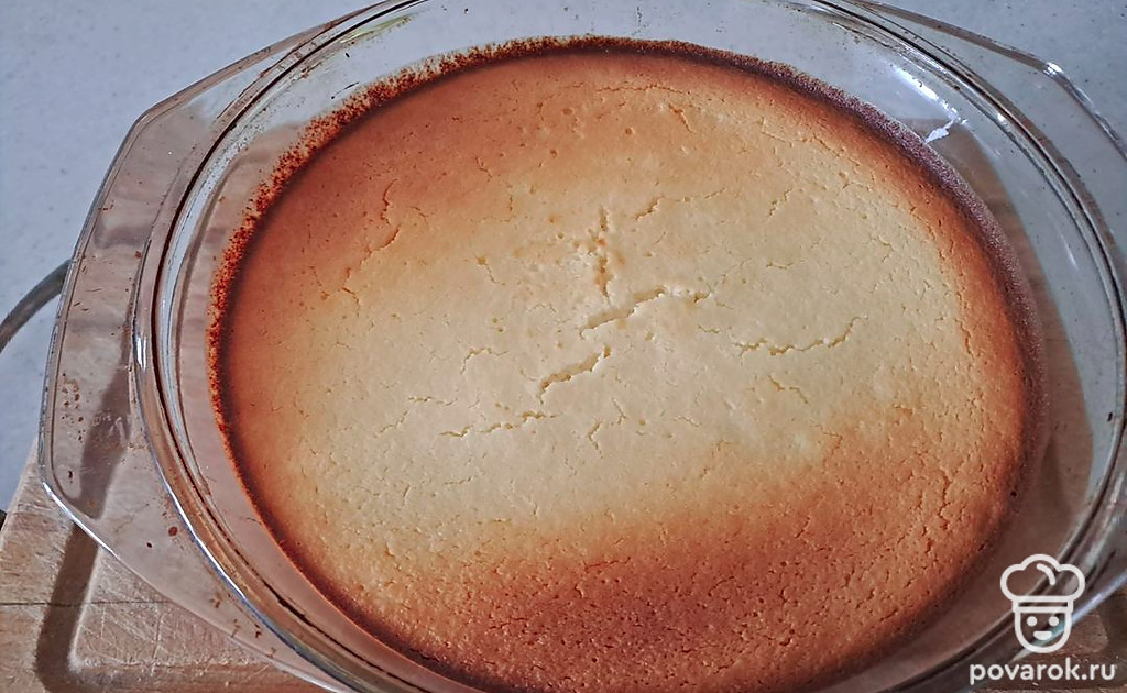 Тесто получится жидковатым, так и должно быть. Оно хорошо льется. Выпекать можно в форме (стеклянной или керамической). Удобно сразу в ней подавать.