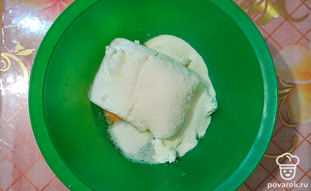 В глубокой посуде смешайте до однородной массы (можно пробить блендером) творог, яйца, манку, сахар и сметану.