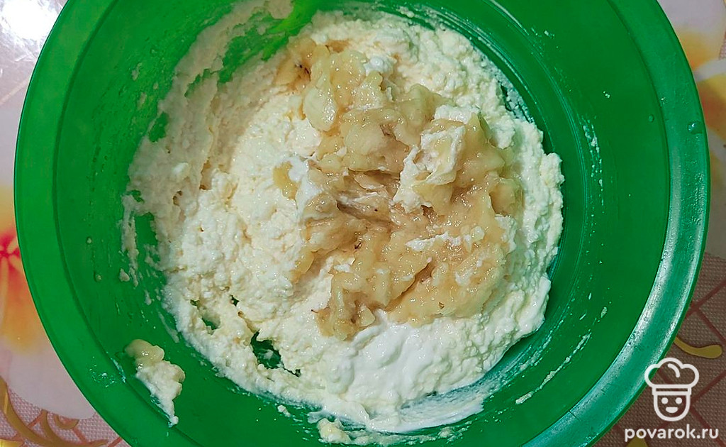 Добавьте банан в миску к остальным ингредиентам, все хорошо перемешайте.