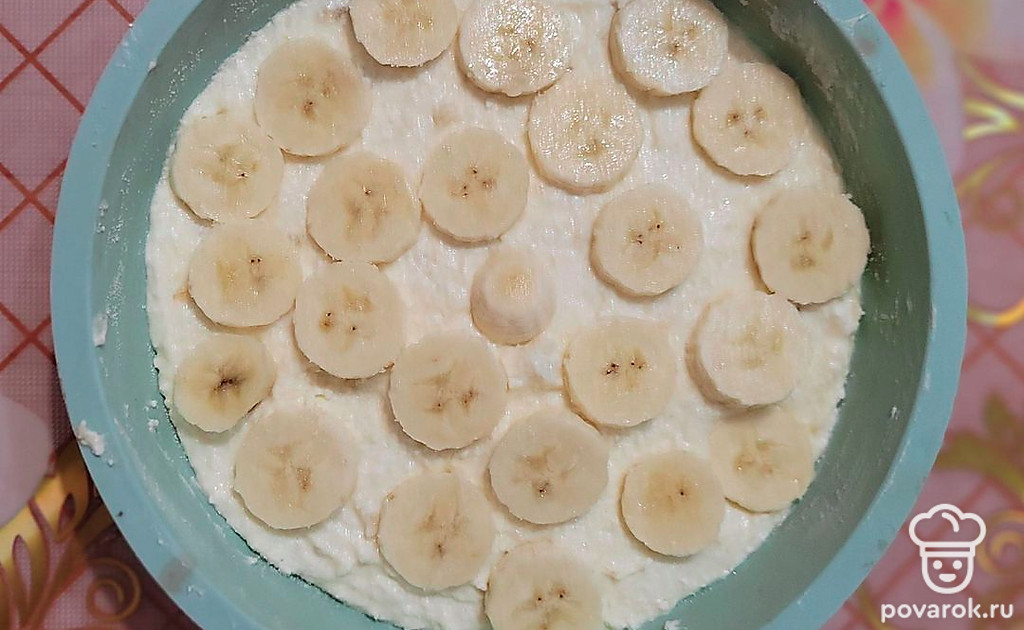 Получившуюся массу переложите в силиконовую форму, сверху выложите нарезанную кусочками вторую половину банана. Выпекайте в духовке при 180 градусах 30 минут.