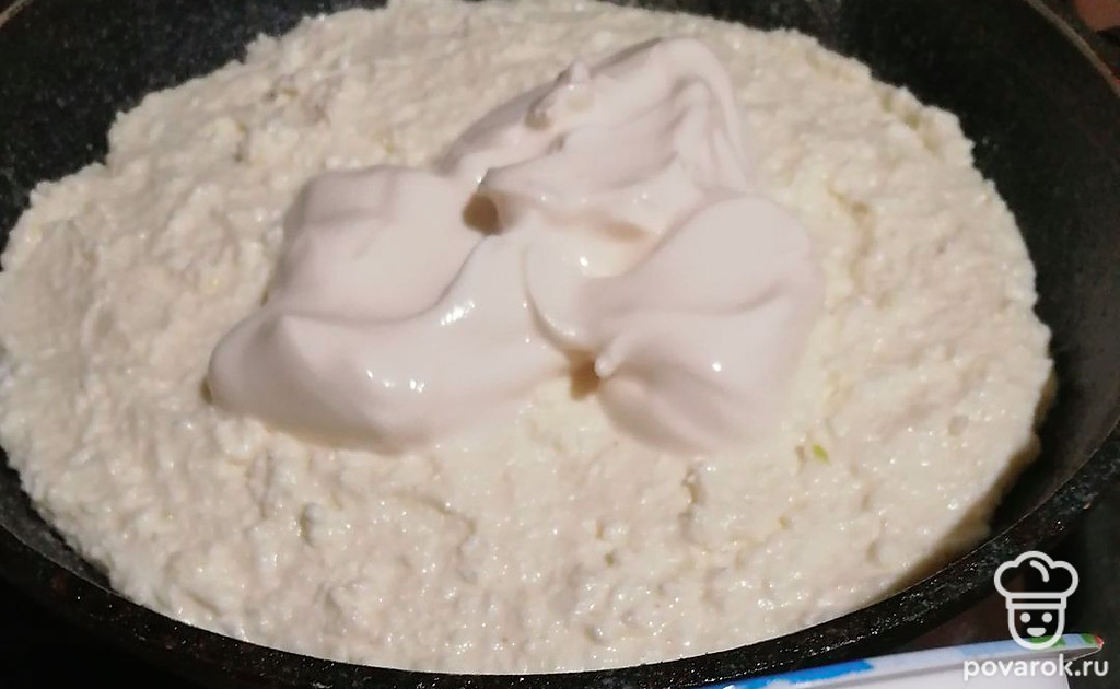 Творожную массу выложите в емкость для запекания, смазанную сливочным маслом. Немного посыпьте манной крупой. Сверху выложите сметану и разровняйте ее. Выпекайте в духовке 40 минут при 180 градусах.