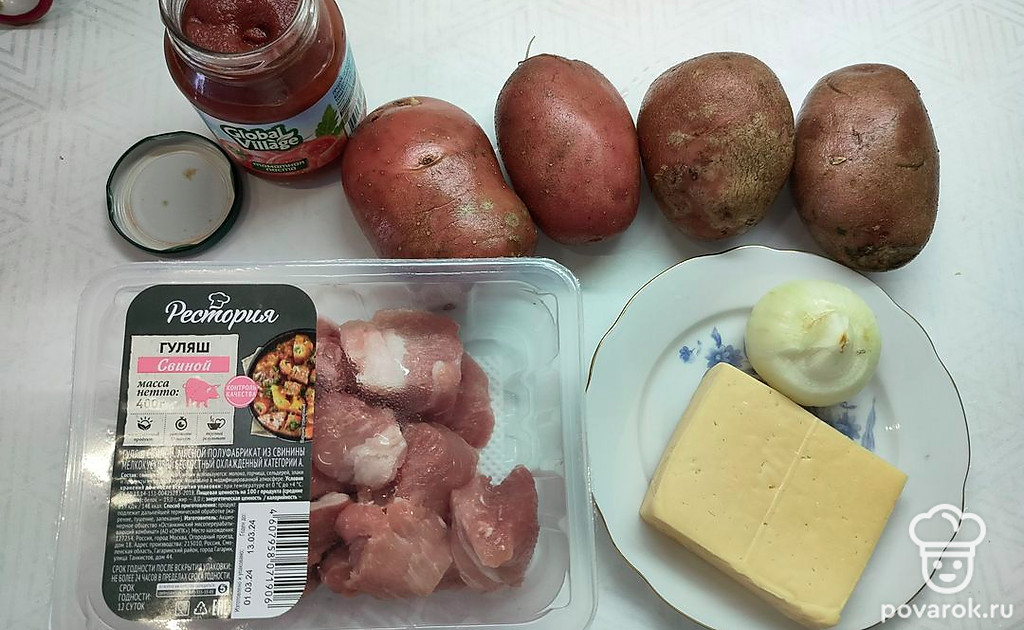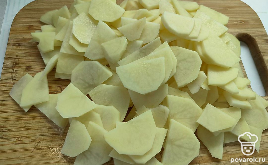 В это время нарежьте лук полукольцами. Сыр натрите на крупной терке. Картошку очистите от кожуры и нарежьте тонкими пластинками.