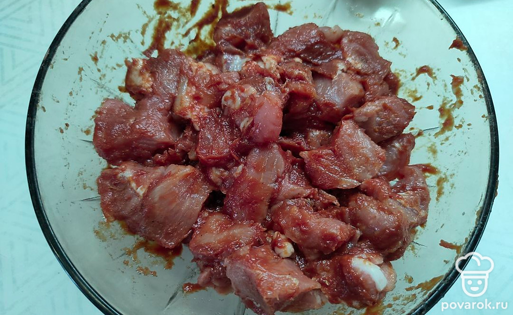 Свинину нарежьте на небольшие кусочки. Посолите и замаринуйте в томатной пасте, специях. Оставьте на полчаса.