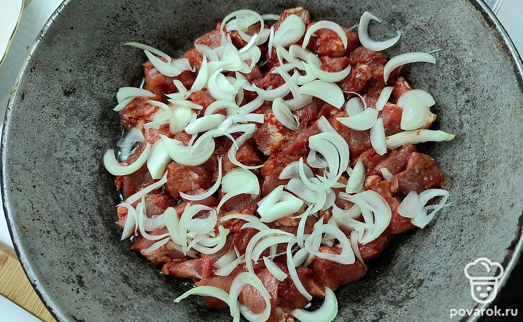 Форму для запекания смажьте растительным маслом. Первым слоем положите мясо. Сверху разложите лук.