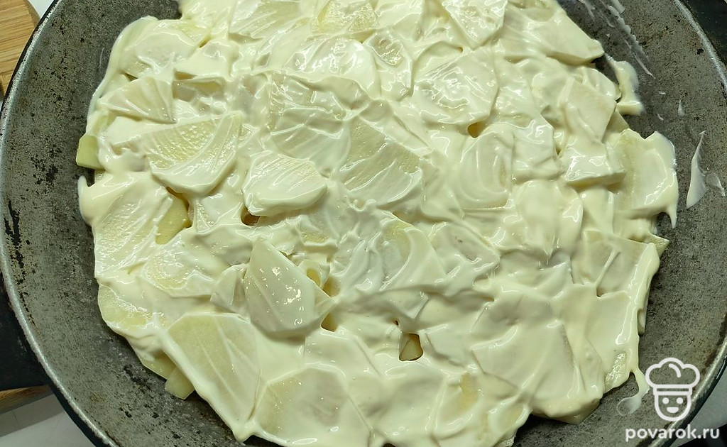 Следующим слоем распределите нарезанный картофель. Посолите. Все смажьте тонким слоем майонеза.