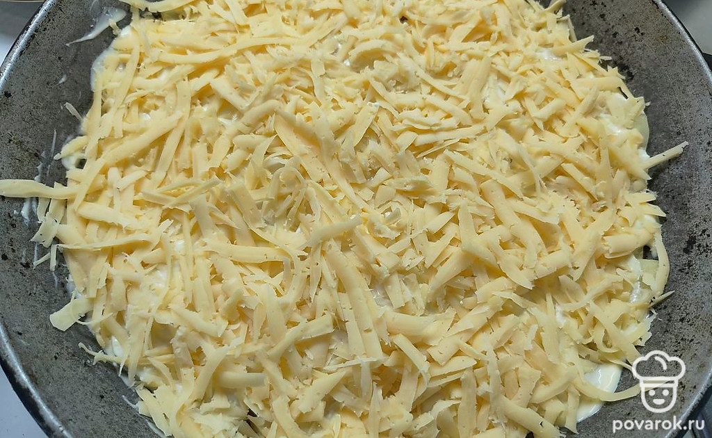 Посыпьте тертым сыром. Поставьте в разогретую до 200 градусов духовку на 30 минут. Если через указанное время сыр зарумянится, то блюдо накройте крышкой или оберните фольгой. Запекайте еще 30 минут.