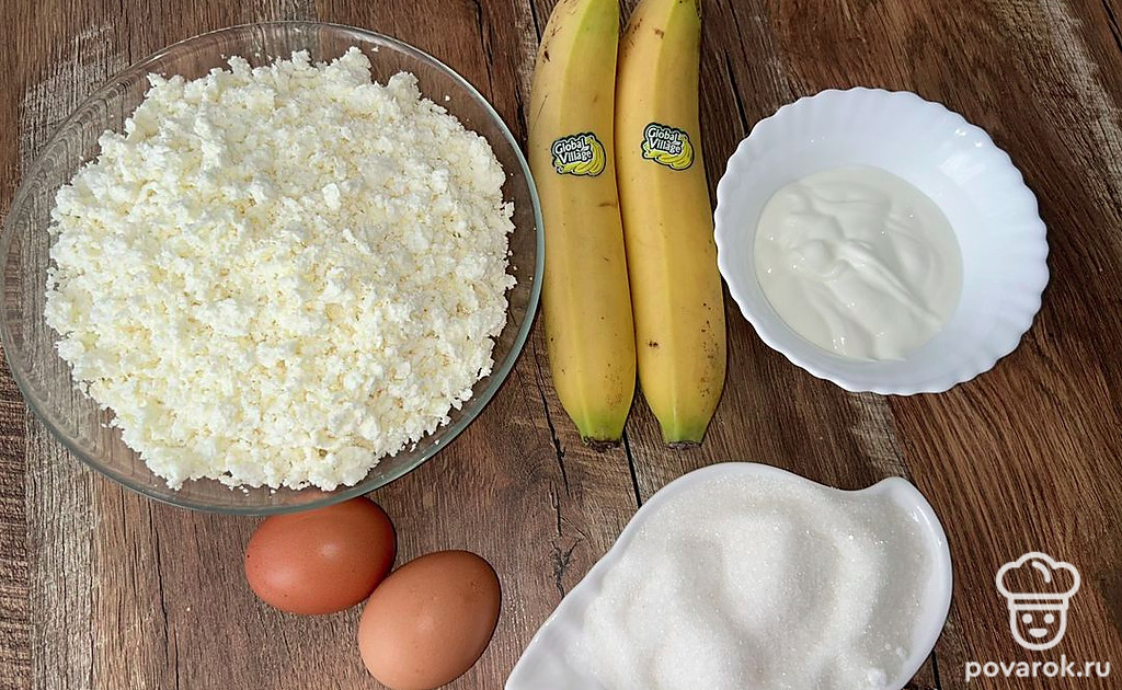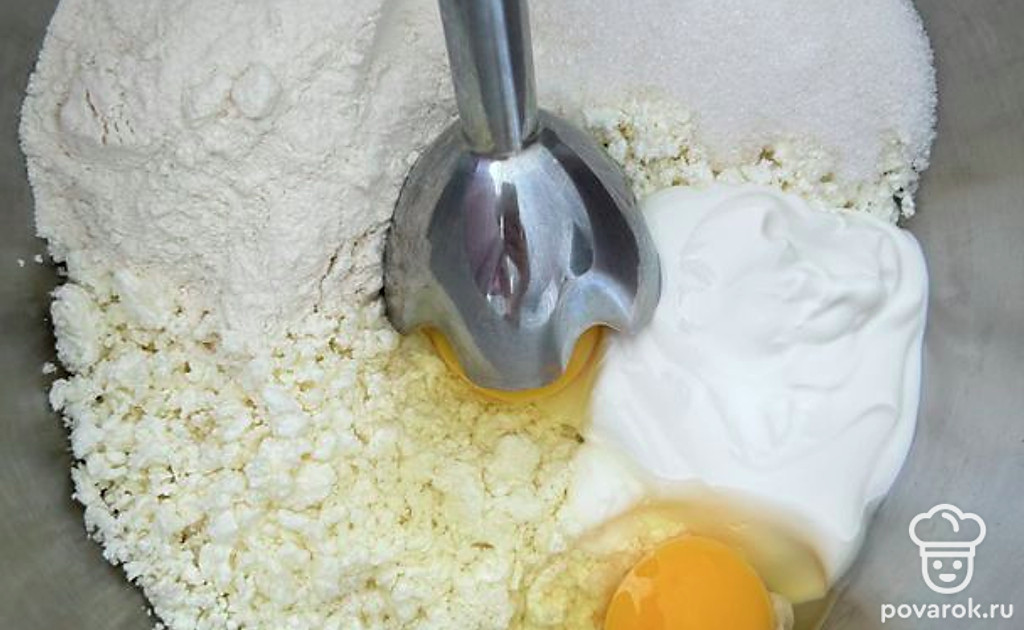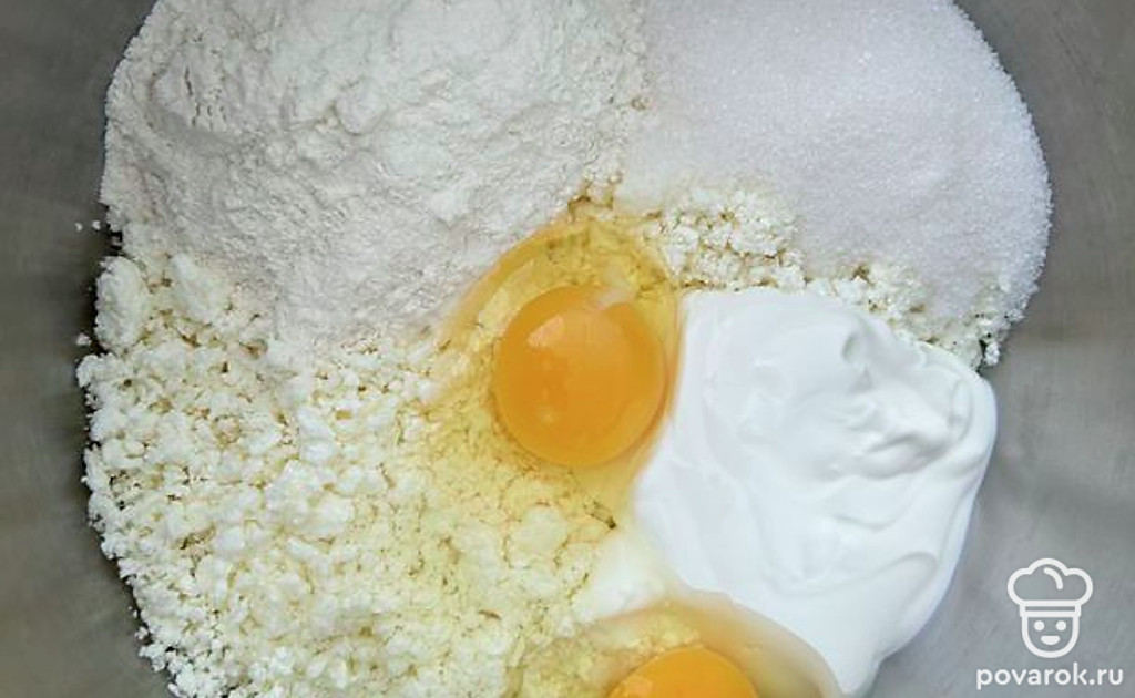В миску переложите творог, добавьте сахар, яйца, сметану и муку.