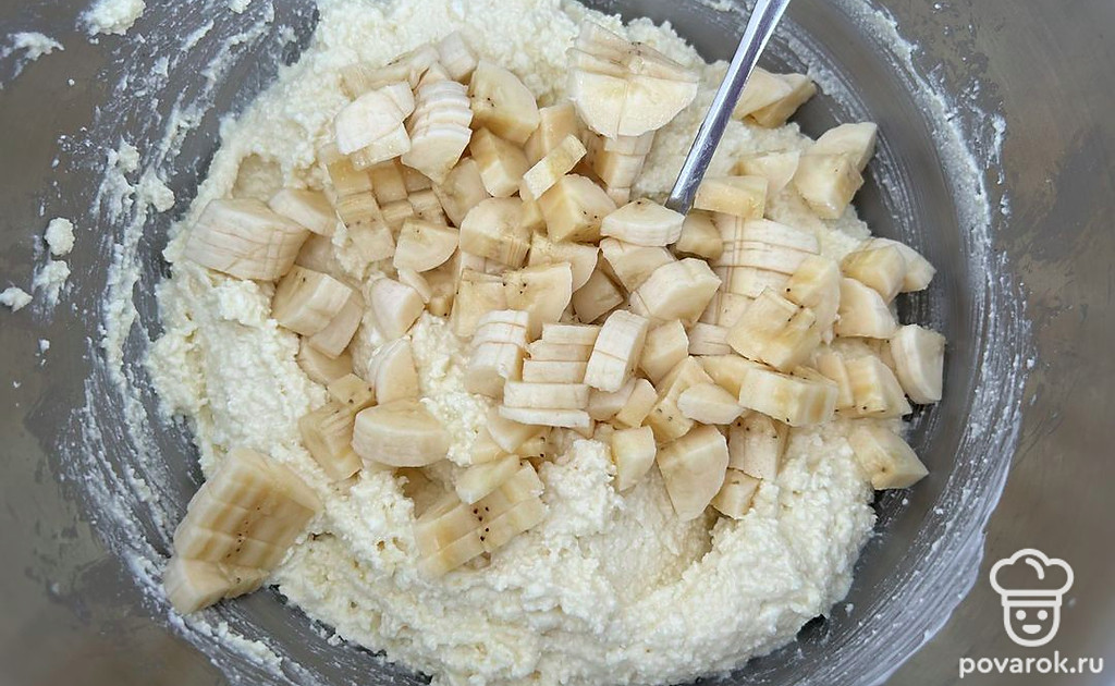 Бананы нарежьте средним кубиком, добавьте в миску и тщательно перемешайте.