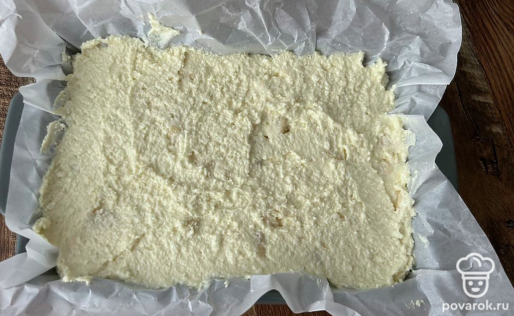 Форму застелите пергаментной бумагой, выложите творожную массу , распределите по форме и отправьте в духовку на 40-45 минут при 160-170 градусах.