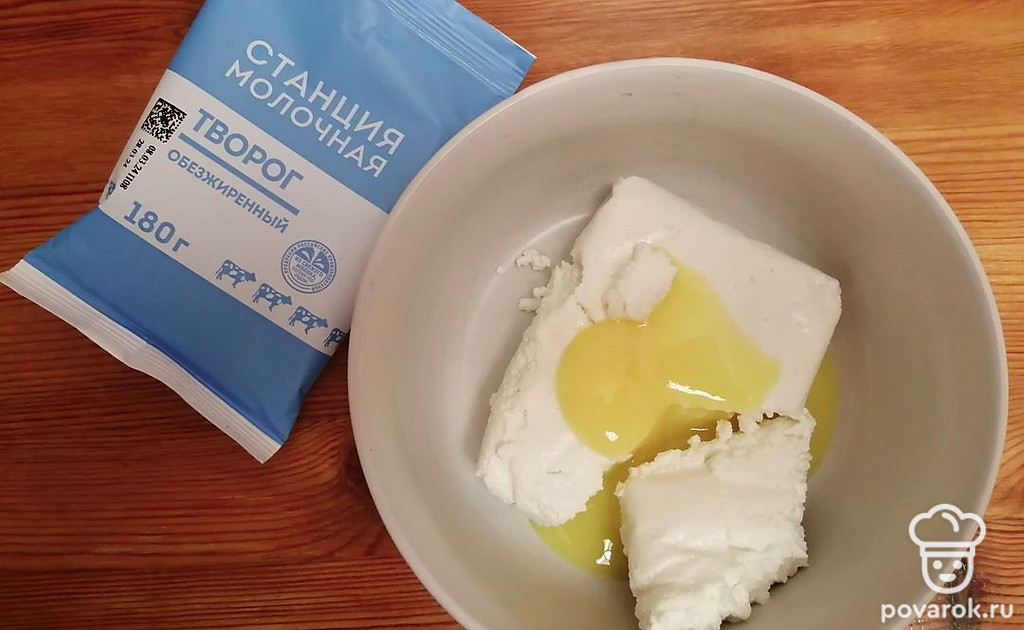 В тарелку выложите творог, добавьте желток куриного яйца. Хорошо перемешайте.