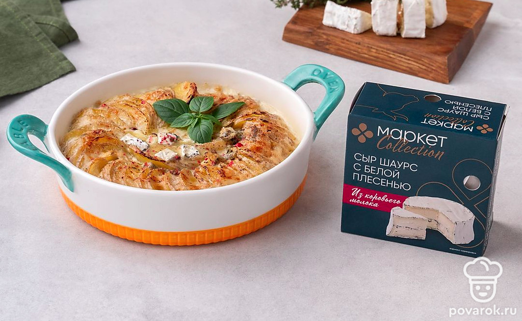 Украсьте гратен ломтиками сыра с белой плесенью.