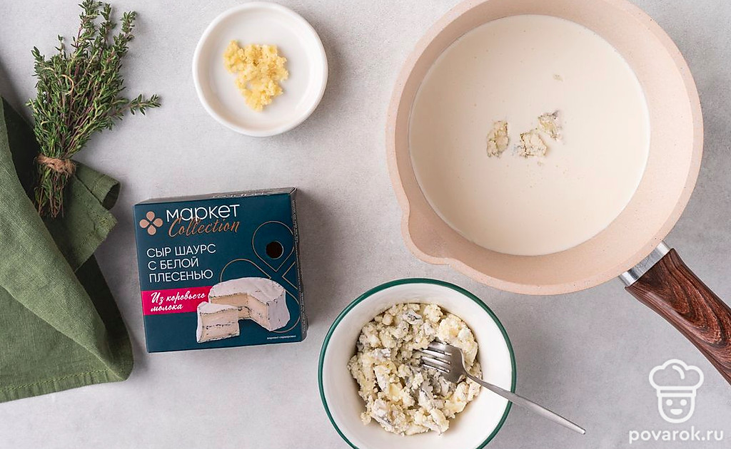 Вылейте сливки в сотейник. Разомните сыр с плесенью вилкой, добавьте его к сливкам. Пропустите чеснок через пресс или измельчите его на терке, выложите его к сливкам и сыру.