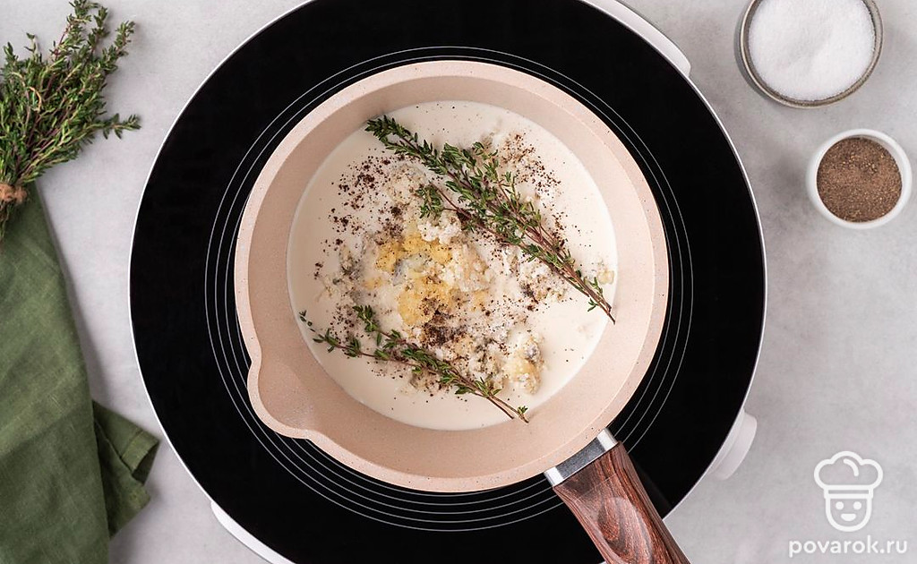Добавьте в сотейник к сливкам и сыру соль, перец и веточки тимьяна. Поставьте посуду на средний огонь и нагрейте массу, постоянно помешивая, в течение 5-10 минут, чтобы сыр начал таять ии смешиваться со сливками. После этого уберите соус с огня