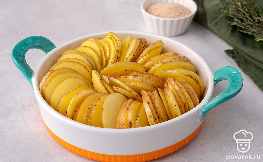 Нарежьте картофель с кожурой очень тонкими круглыми ломтиками, толщиной не более 1 мм. Разложите его в форме для запекания, ставя ломтики вертикально по кругу вдоль бортиков формы и в оставшемся пространстве в центре формы.