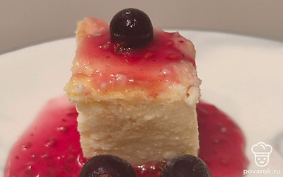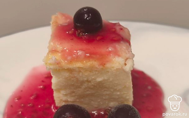 Нарежьте творожную запеканку порционно. Подавайте со сметаной и вареньем. Украсьте свежими ягодами и фруктами.