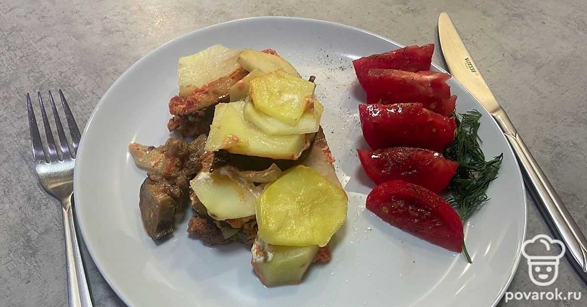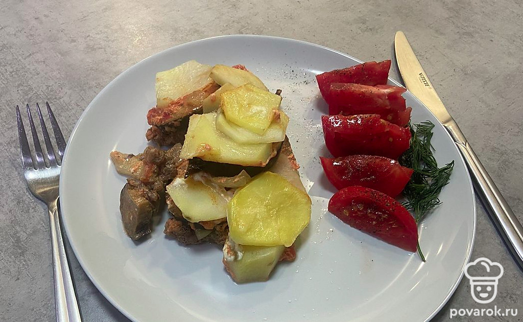 Картофельная запеканка с фаршем и баклажанами в томатном соусе