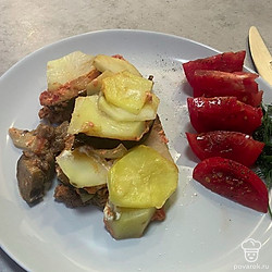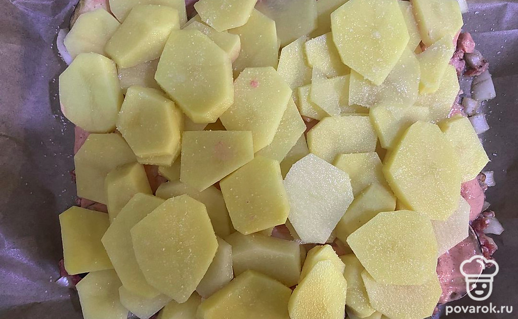 Сверху разложите картофель, нарезанный на кружочки. Посолите по вкусу и отправьте запекаться в разогретую до 190 градусов духовку примерно на час. Время зависит от мощности вашей духовки.