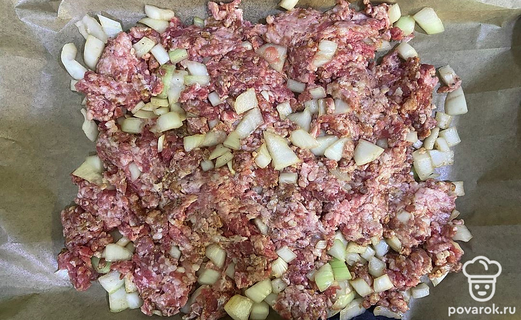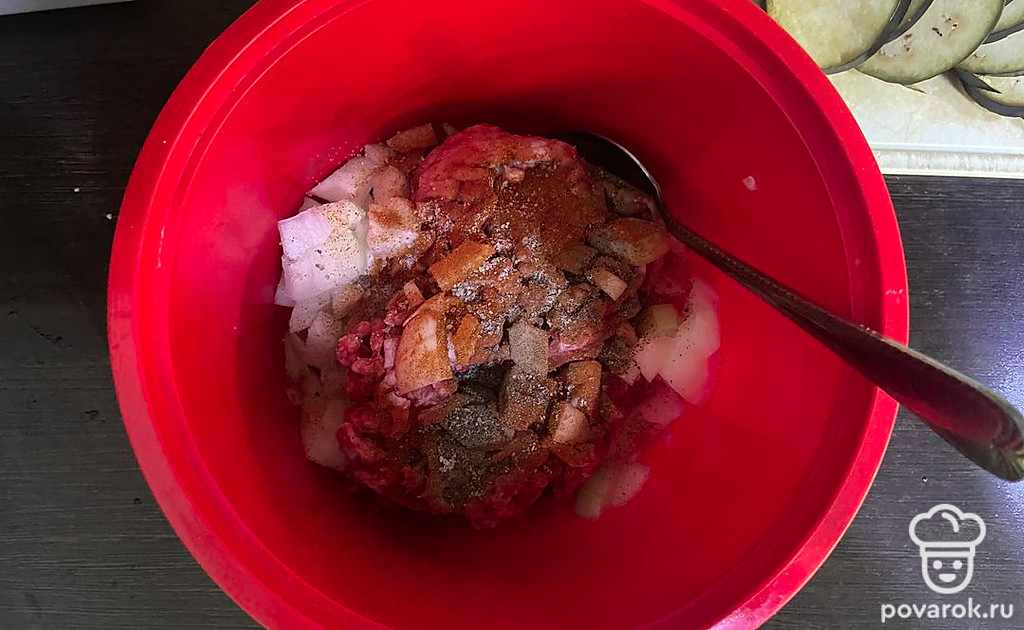 Фарш выложите в глубокую миску. Добавьте соль, перец и молотую паприку по вкусу. Перемешайте.