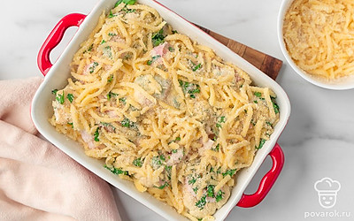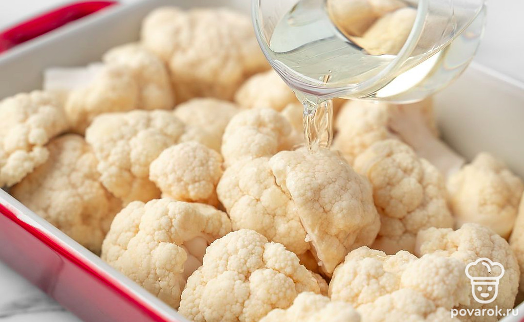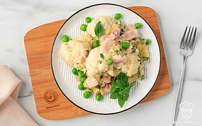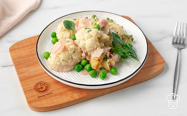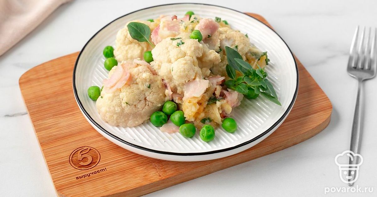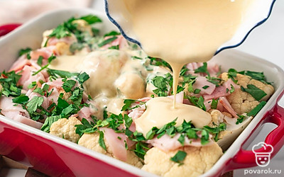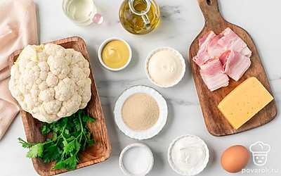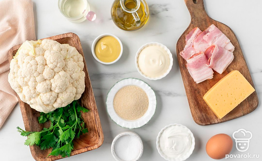 Цветная капуста быстро пропекается в духовке, сохраняет все соки и вкус, отлично сочетается с расплавленным сыром, сливками или сметаной. К тому же к ней при желании легко добавить любые другие овощи. Здесь капусту дополняют ломтики бекона и пряная заливка из майонеза, горчицы и сметаны. Для запекания подойдет как свежая, так и замороженная цветная капуста.