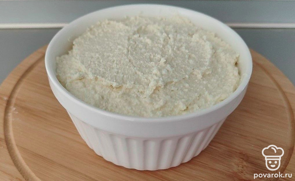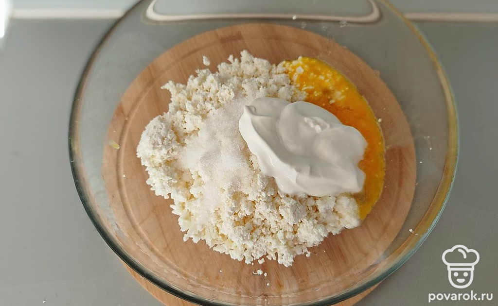 Добавьте к творогу яйцо, сахар, соль, сметану. Хорошо перемешайте или пробейте блендером. Добавьте сливочное масло комнатной температуры и снова перемешайте.