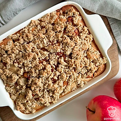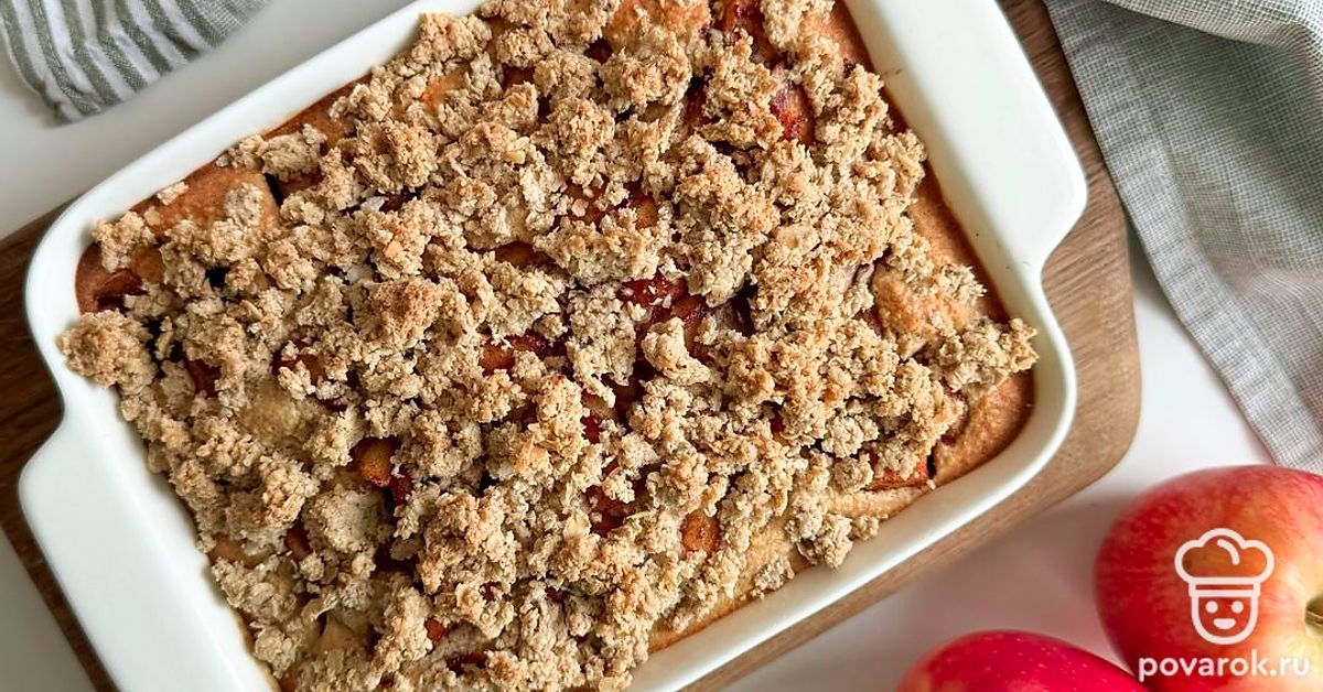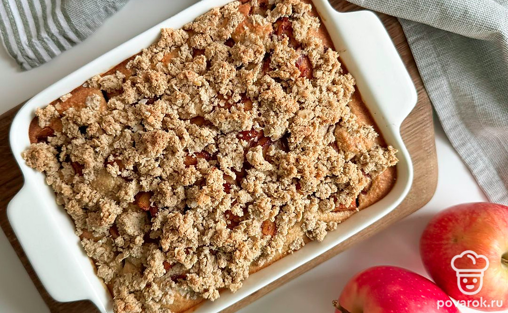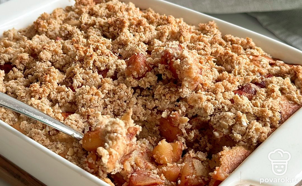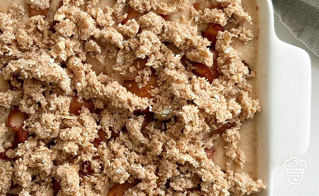 Измельчите овсяные хлопья в кофемолке. Перетрите получившуюся муку с маслом в крошку. Посыпьте этой крошкой запеканку и отправьте в разогретую до 180 градусов духовку на 25-30 минут.