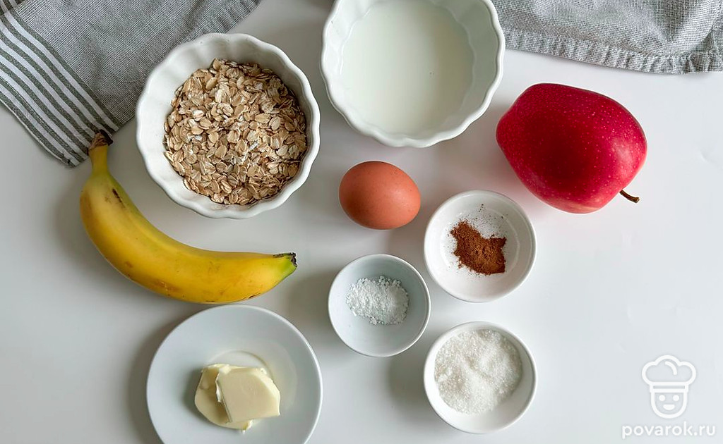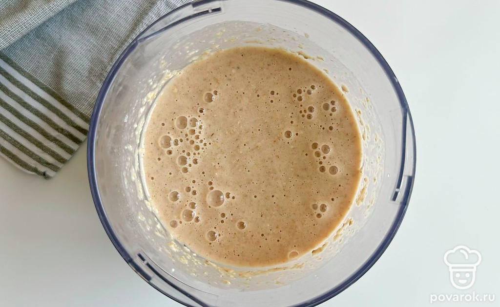Всыпьте в чашу блендера овсяные хлопья, влейте молоко. Добавьте яйцо, банан, разрыхлитель и сахар. Пробейте все блендером до однородного состояния.