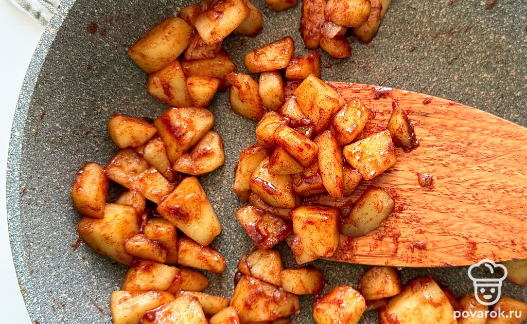 Почистите яблоко и нарежьте кубиками. Растопите сливочное масло. Переложите в сковороду яблоки, всыпьте сахар и корицу. Перемешайте и обжарьте до мягкости яблок.