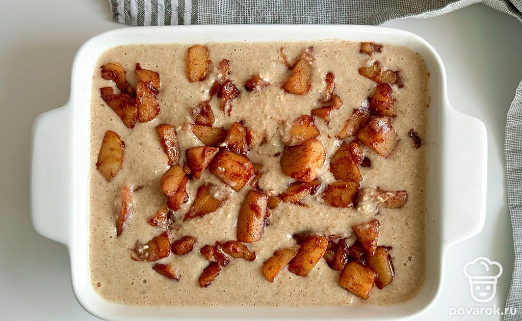 Вылейте тесто в форму для запекания. Выложите яблоки на тесто.