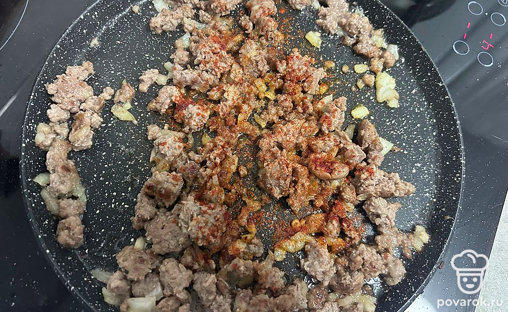 На растительном масле обжарьте фарш и лук, нарезанный мелким кубиком, в течение 7 минут.