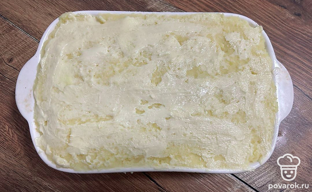 Следующим слоем выложите картошку. Смажьте размягченным сливочным маслом. Отправьте в духовку при 180 градусах на 15-20 минут.