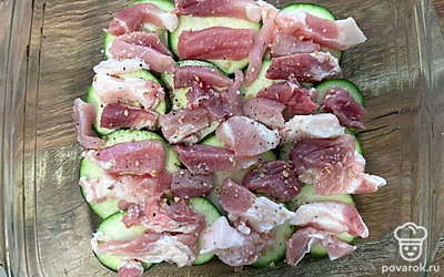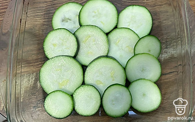 Кабачок нарежьте кружками. На дно формы выложите слой из кабачков.