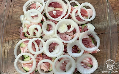 Лук нарежьте кольцами. Выложите следующим слоем.