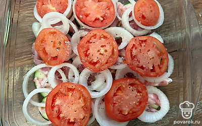 Помидор нашинкуйте кольцами. Выложите на лук. Слегка поперчите и посолите.