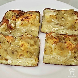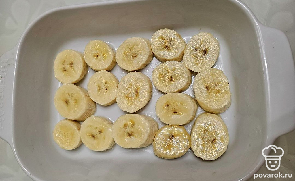 Банан очистите от кожуры и нарежьте слайсами. Форму для запекания смажьте небольшим количеством масла. Выложите банан на дно.