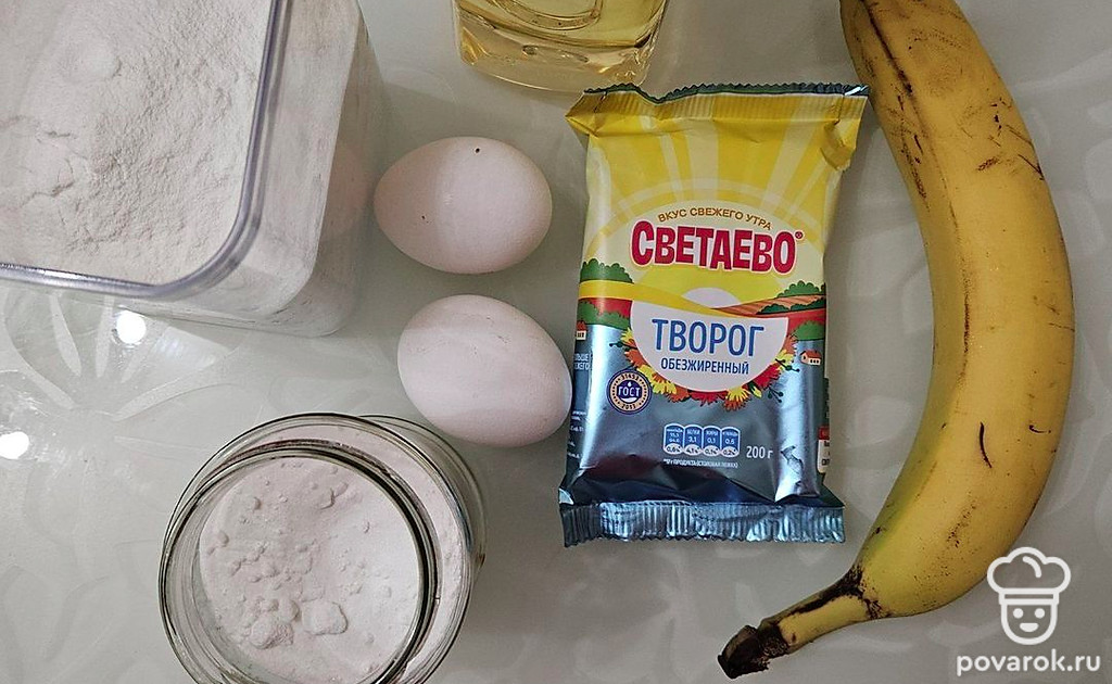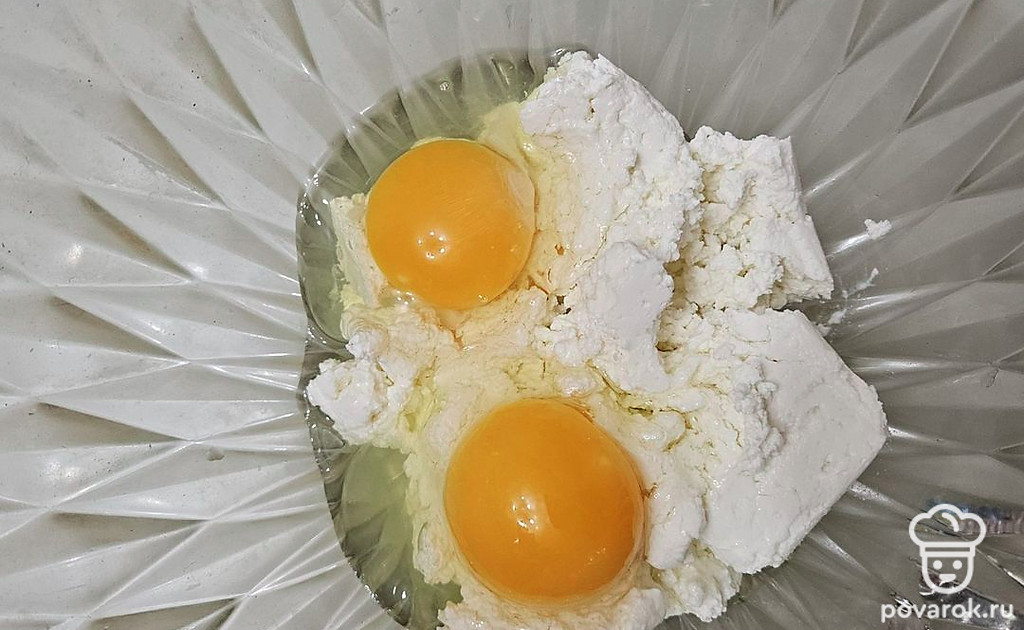 В отдельной емкости смешайте творог с яйцами. Добавьте сахар по вкусу, перемешайте. Всыпьте муку с разрыхлителем и еще раз перемешайте до однородной консистенции.