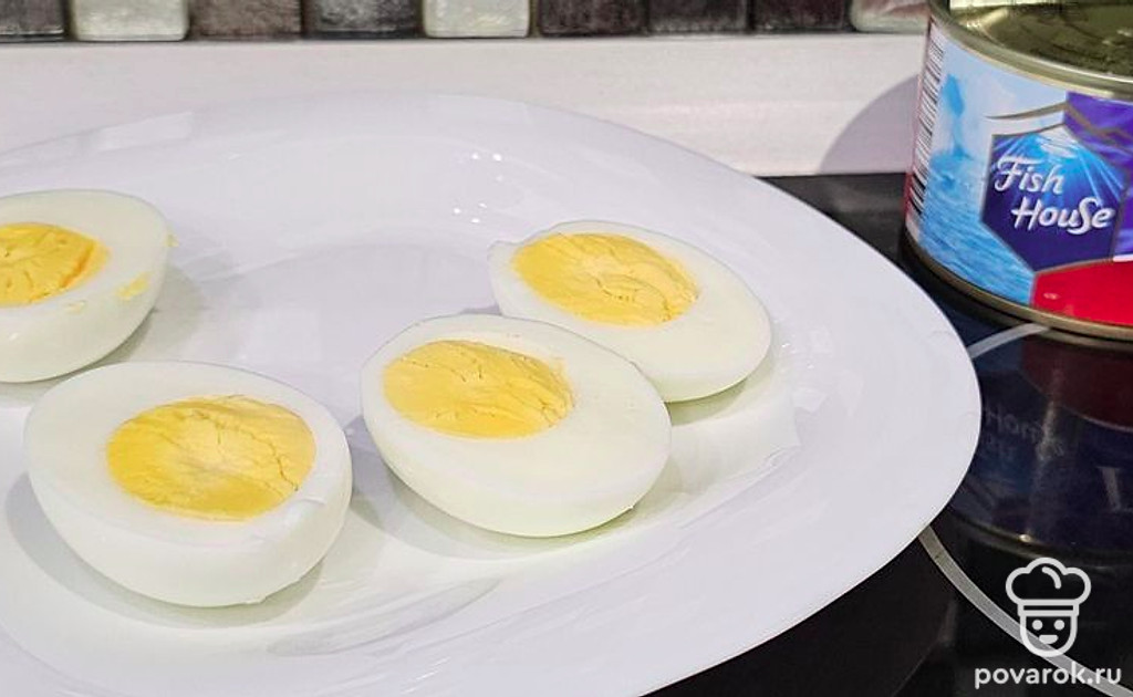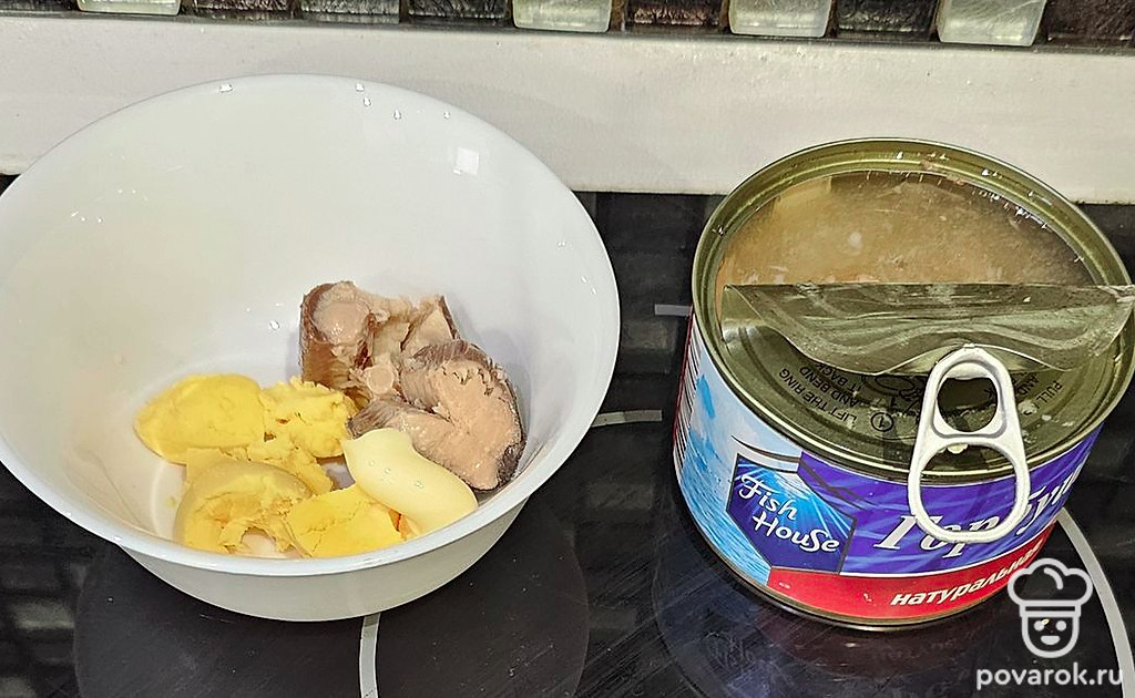 Выложите в миску желток, горбушу и майонез. Разомните все и перемешайте.