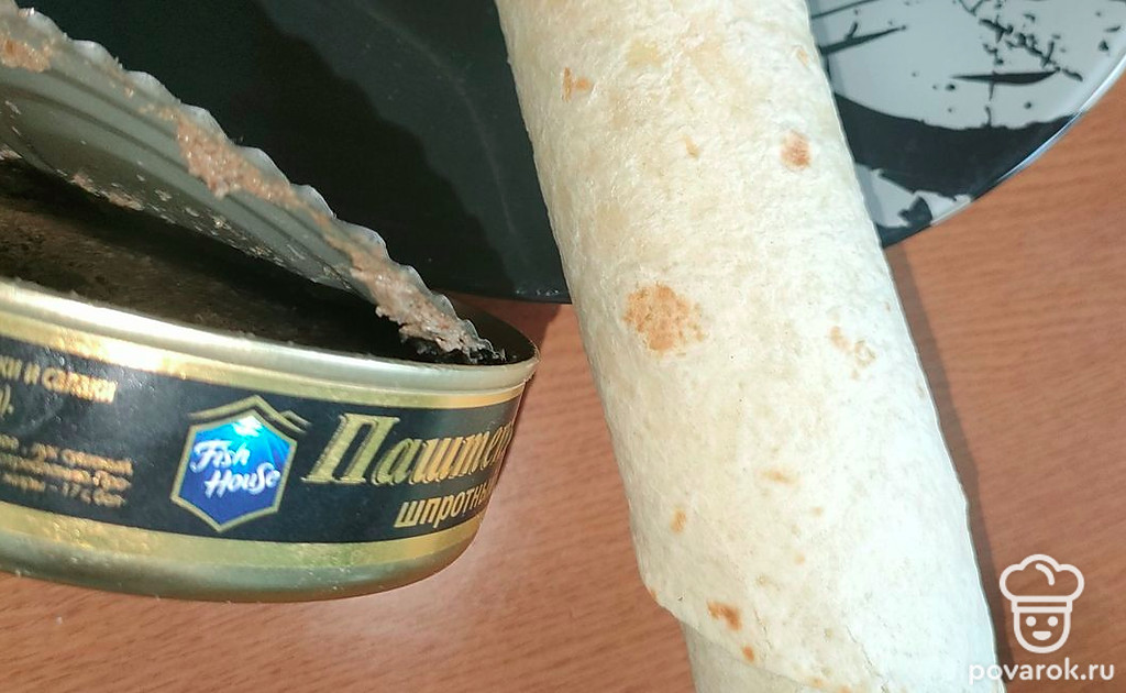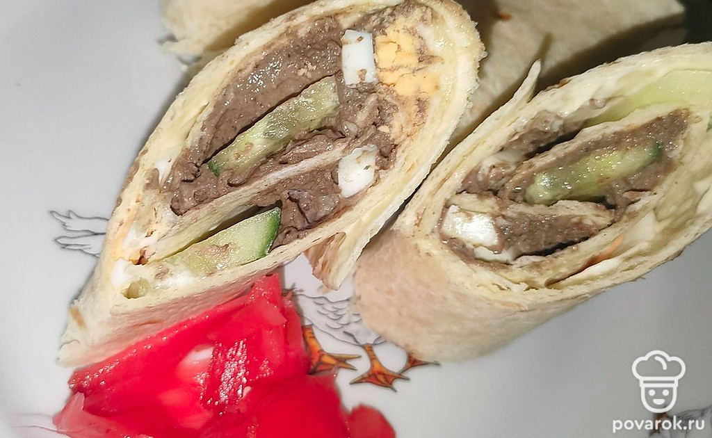 Сверните лепешку рулетом. Оставьте на полчаса в холодильнике. У меня не было времени, поэтому блюдо сразу нарезала и подала к столу.
