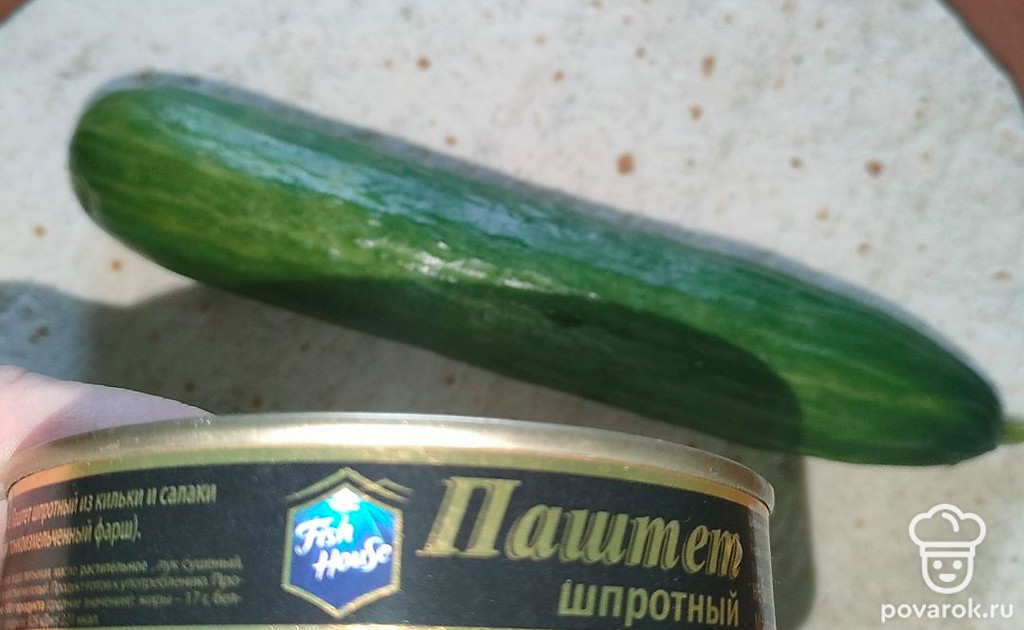 Тортилью смажьте майонезом, огурцы нарежьте пластинками.