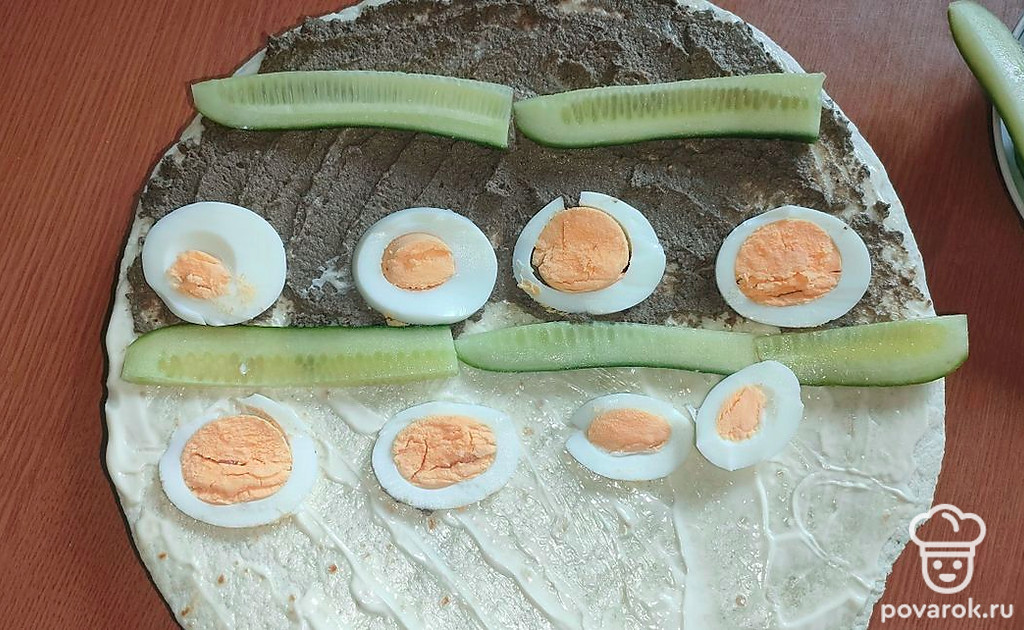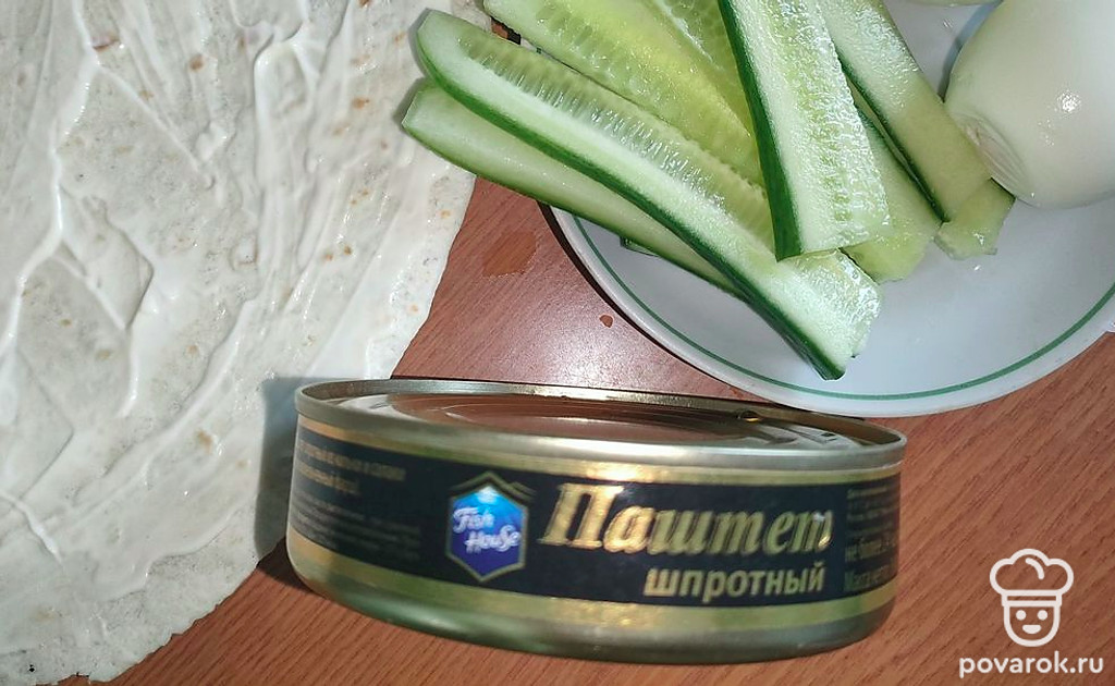Поверх майонеза выложите половину баночки шпротного паштета, огурцы. Нарежьте яйца.