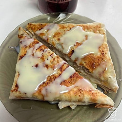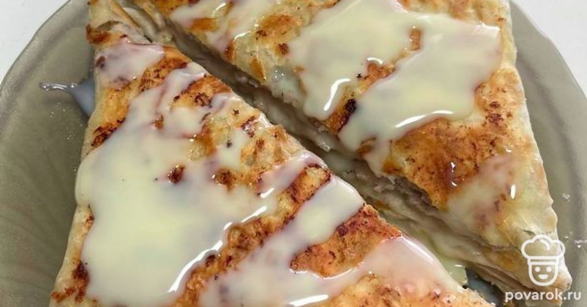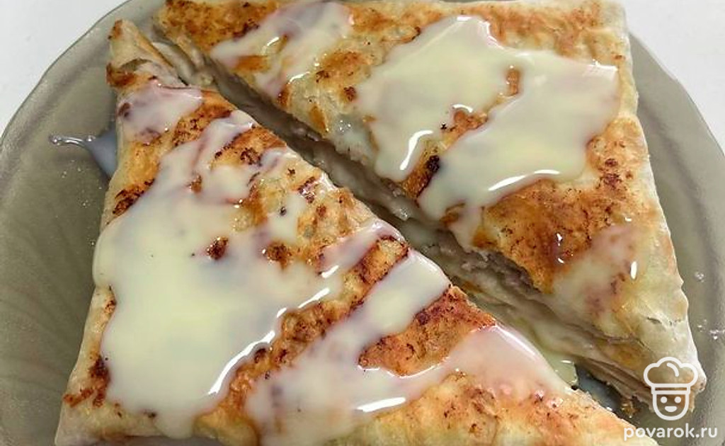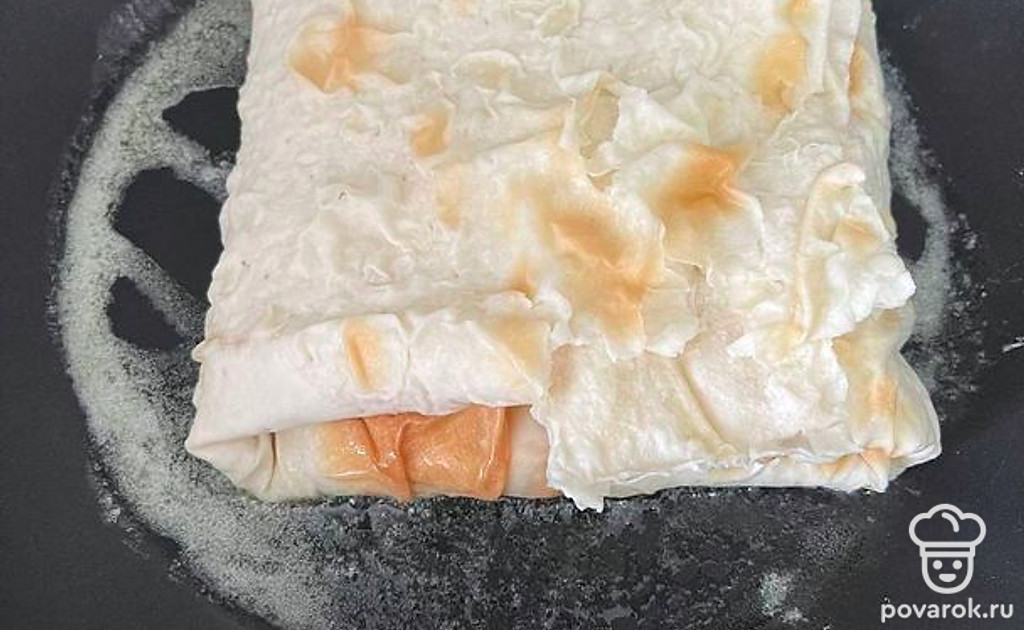 Лаваш окуните в воду и тут же достаньте. На сковороде разогрейте сливочное масло. Выложите лаваш на сковороду с маслом. Вылейте начинку. Заверните лаваш конвертиком и обжарьте с двух сторон под крышкой на среднем огне.