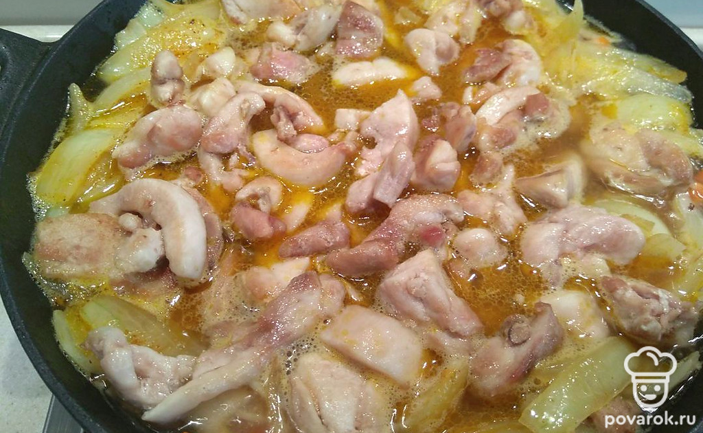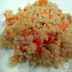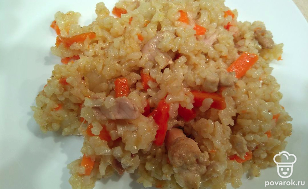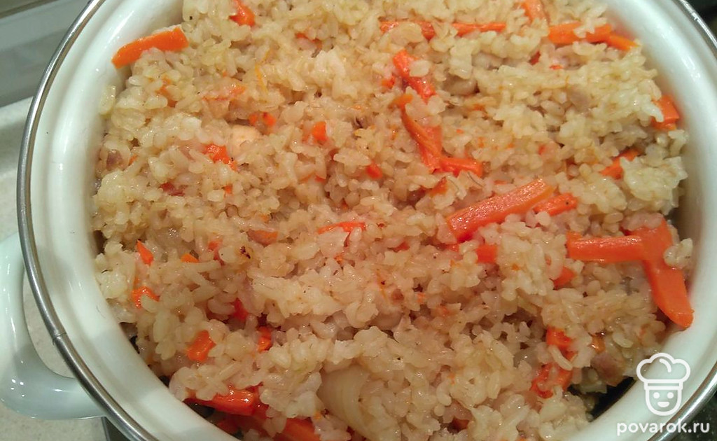 Плотно накрыть крышкой, уменьшить огонь и готовить 30 мин. Затем аккуратно перемещайте плов и выложите на блюдо.
