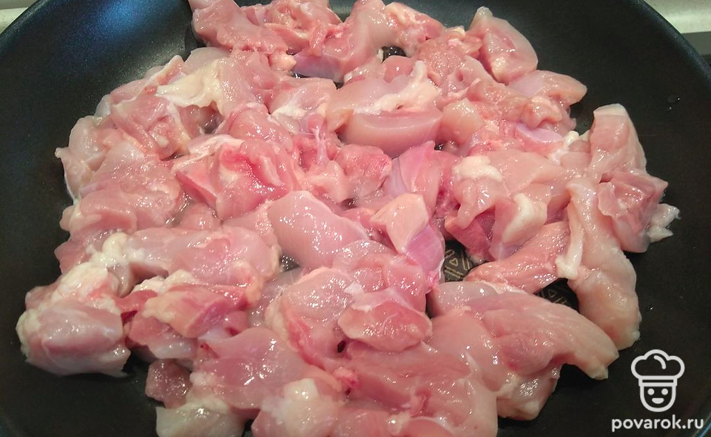 Мясо курицы порезать, выложить в сковороду, обжарить на сильном огне и переложить в тарелку.