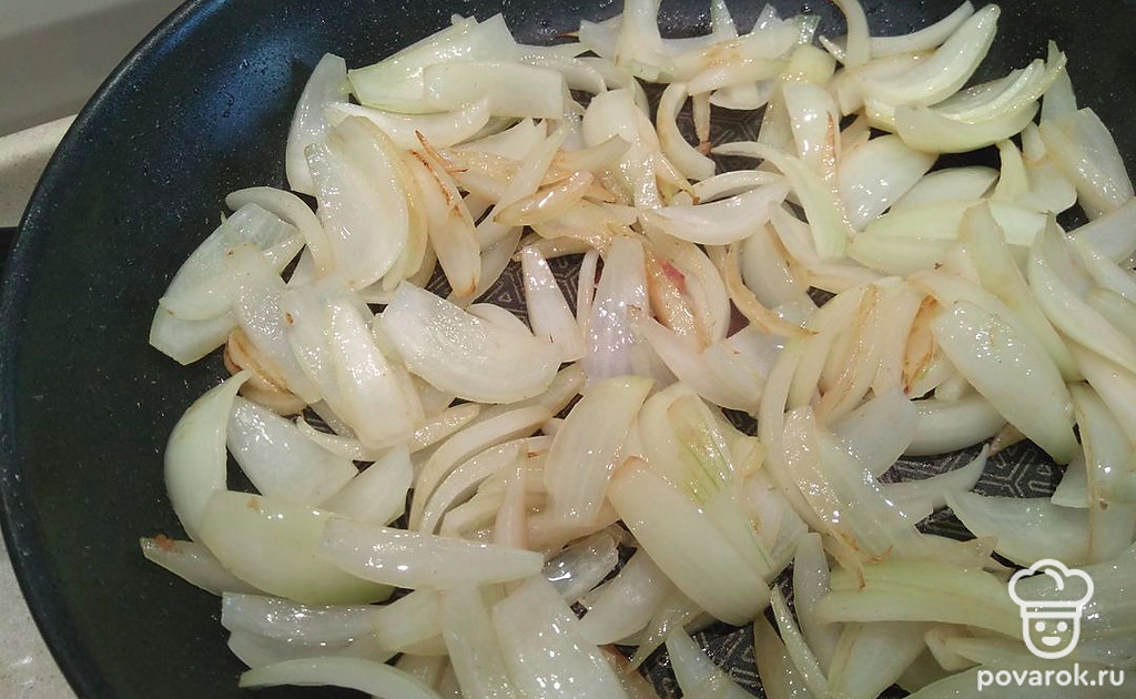 Лук порезать перьями и жарить на среднем огне 7 мин., морковь нарезать брусочками и жарить 10 мин.