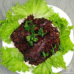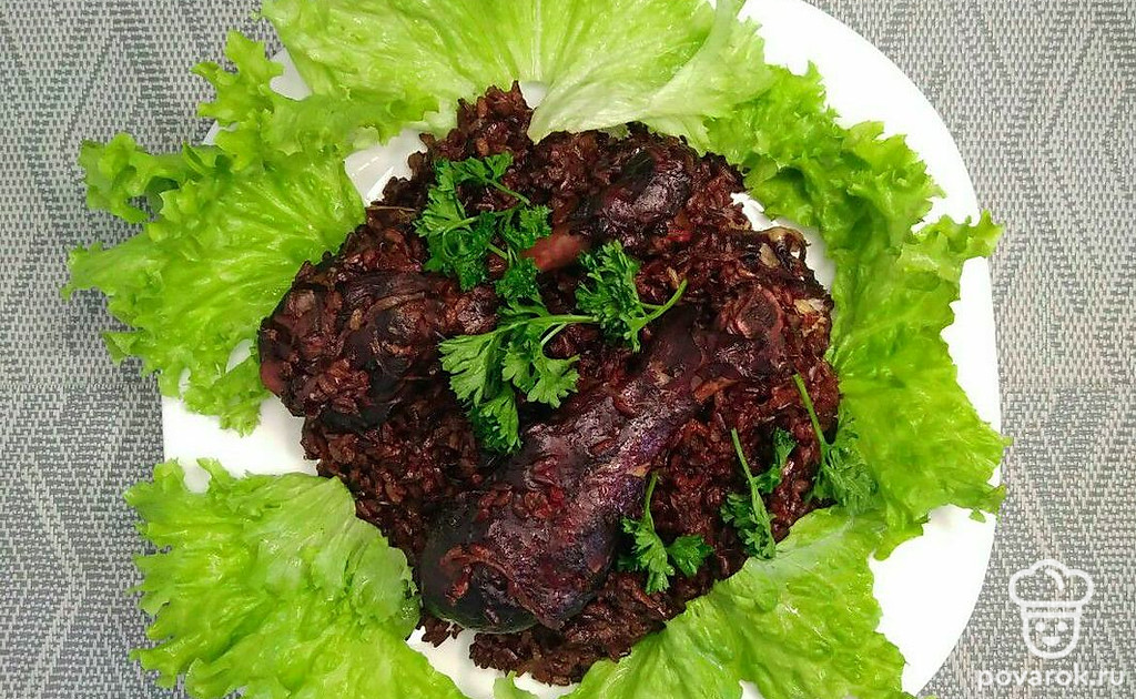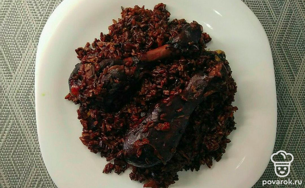 Бурый рис по своему составу очень похож на обычный белый рис, но он значительно полезнее для организма, так как с него не счищают внешнюю отрубную оболочку. Этот рис имеет мягкий, хлебный вкус. А в сочетании с нежным мясом куриных ножек, тушеных овощей, чеснока, ароматных специй — из него получается насыщенное, полезное и вкусное блюдо.