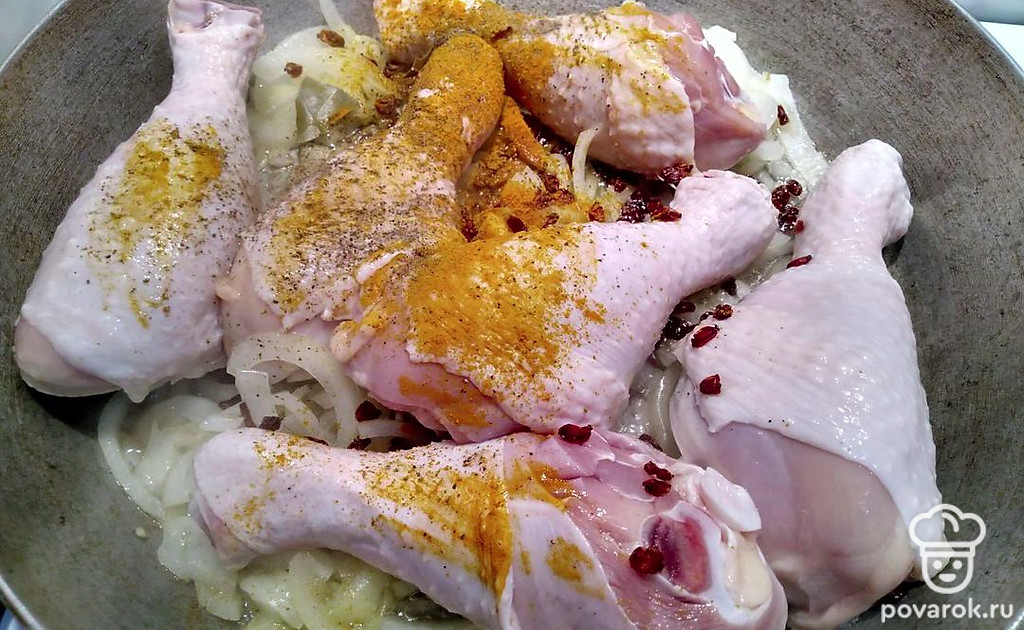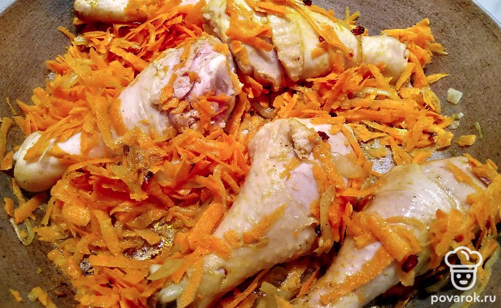 Разогрейте в казане подсолнечное масло и добавьте нарезанный мелко репчатый лук, жарьте его до прозрачности. Теперь, положите в казан куриные ножки, помешайте и жарьте их 5 минут. Затем – нарезанную полукольцами морковь, жарьте еще 3 минуты, иногда помешивая.