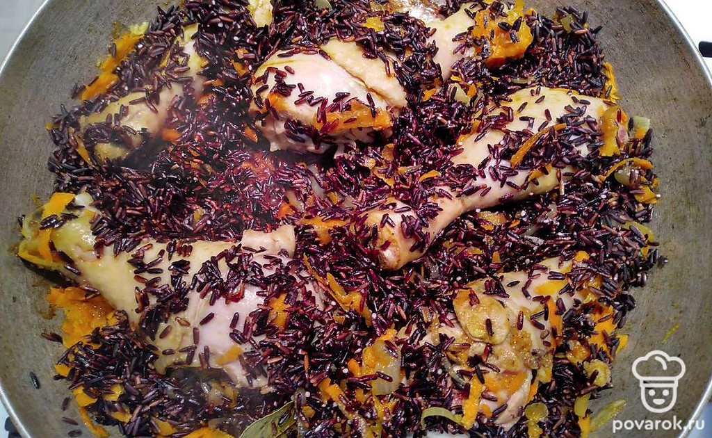 Промойте под проточной водой бурый рис, добавьте его в казан. Все ингредиенты залейте водой на 1-2 см, попробуйте на соль и перец, если нужно, досолите и поперчите еще. Закройте крышку, продолжайте тушить плов 20 минут.
