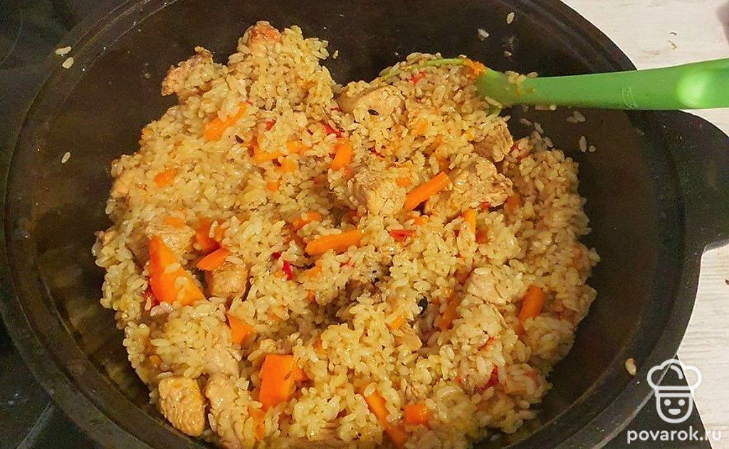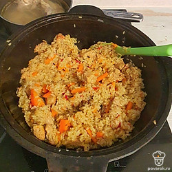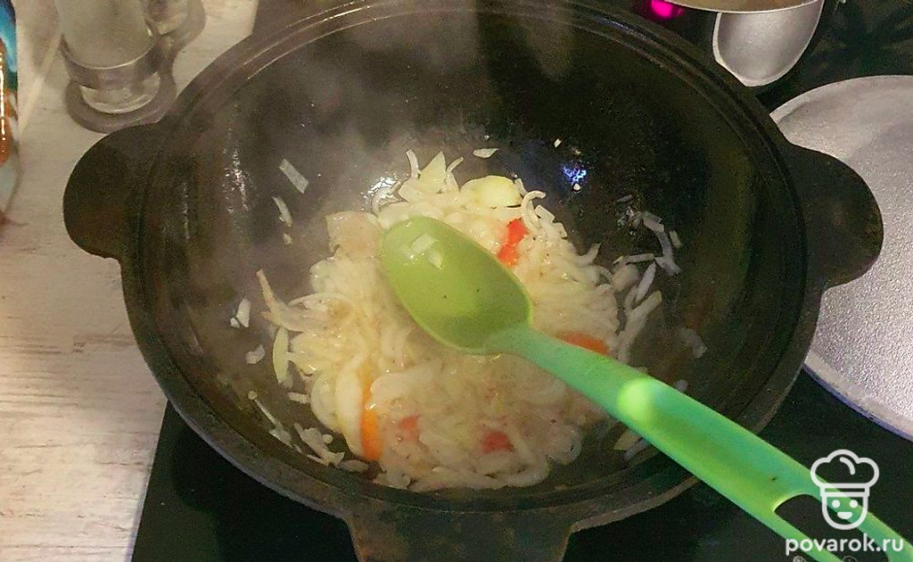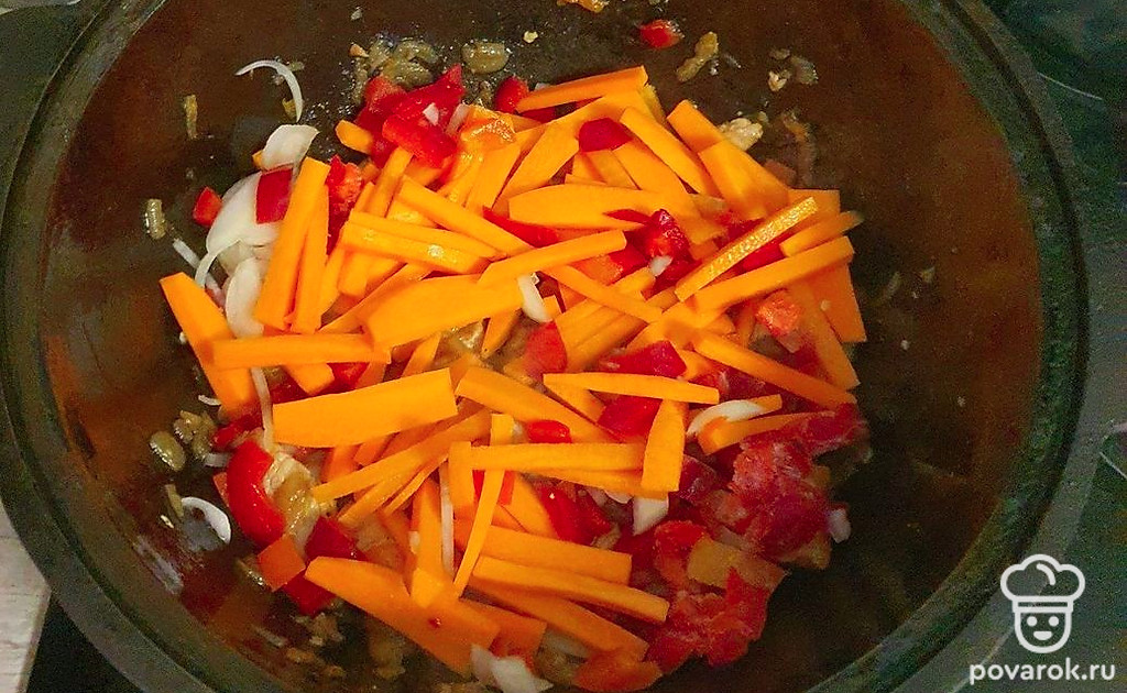 Выложите в казан нарезанные тонкими брусочками морковь и перец. Перемешайте. Обжарьте всё вместе в течение 7-10 минут. Посолите, добавьте специи.