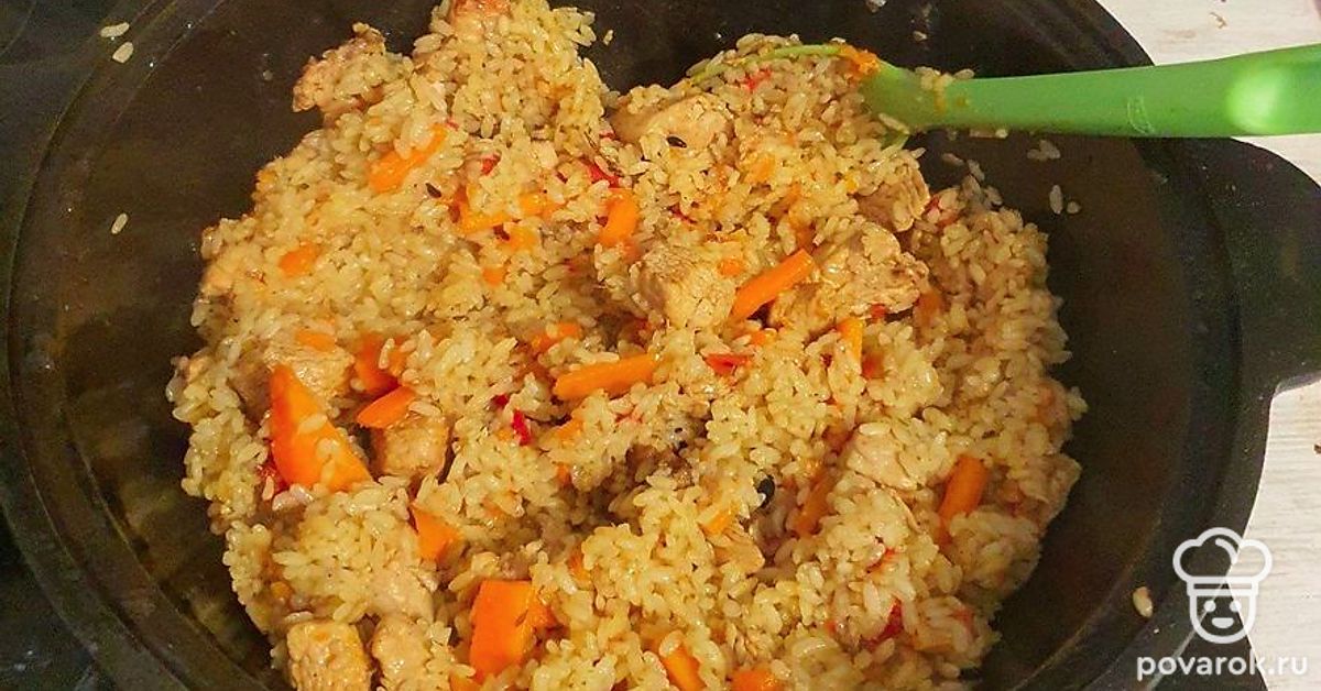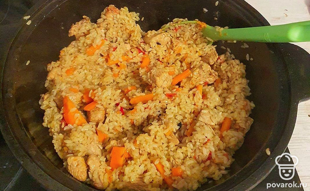 Всыпьте рис. Влейте воду, перемешайте. Сверху в рис вставьте зубчики чеснока. Доведите плов до кипения. Убавьте огонь и готовьте под крышкой 20 минут.